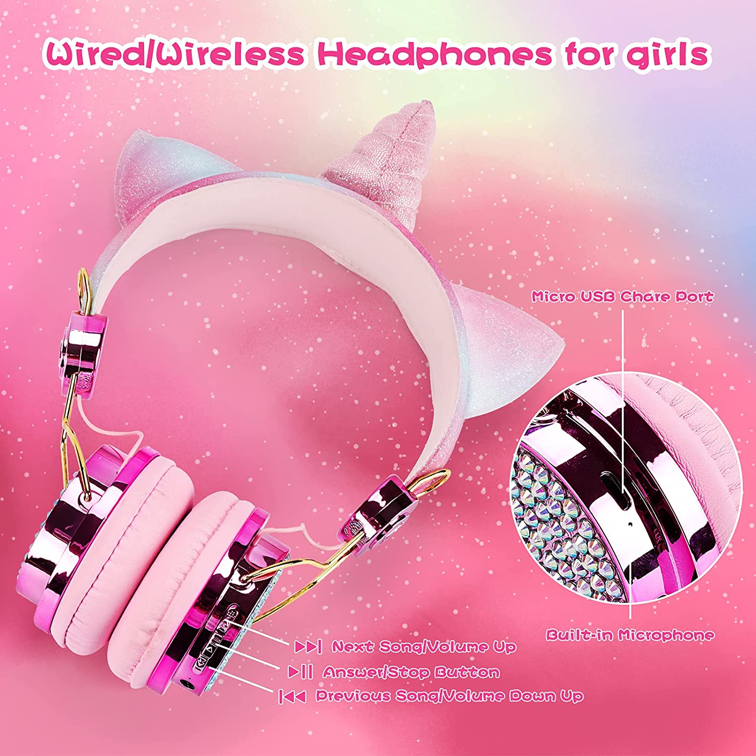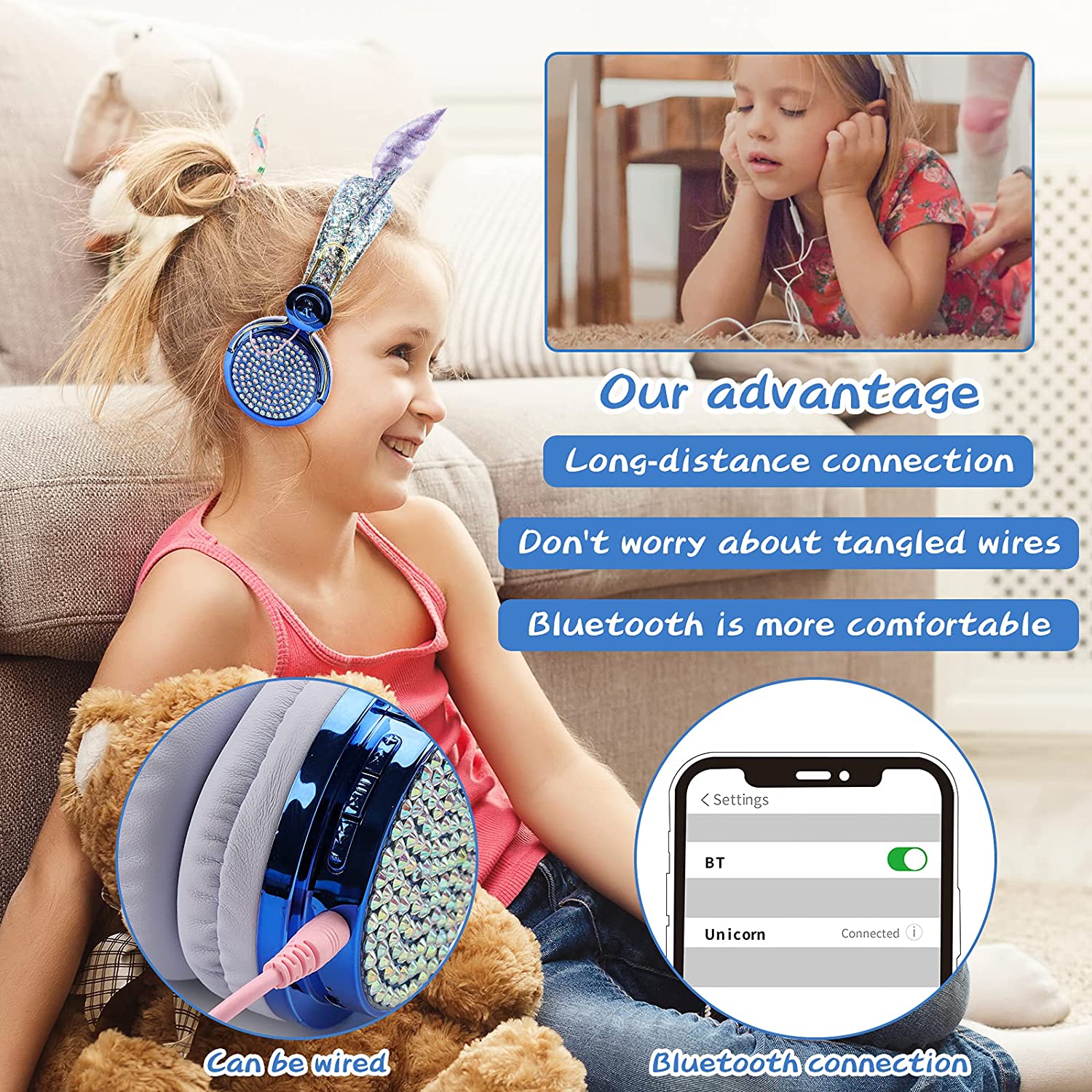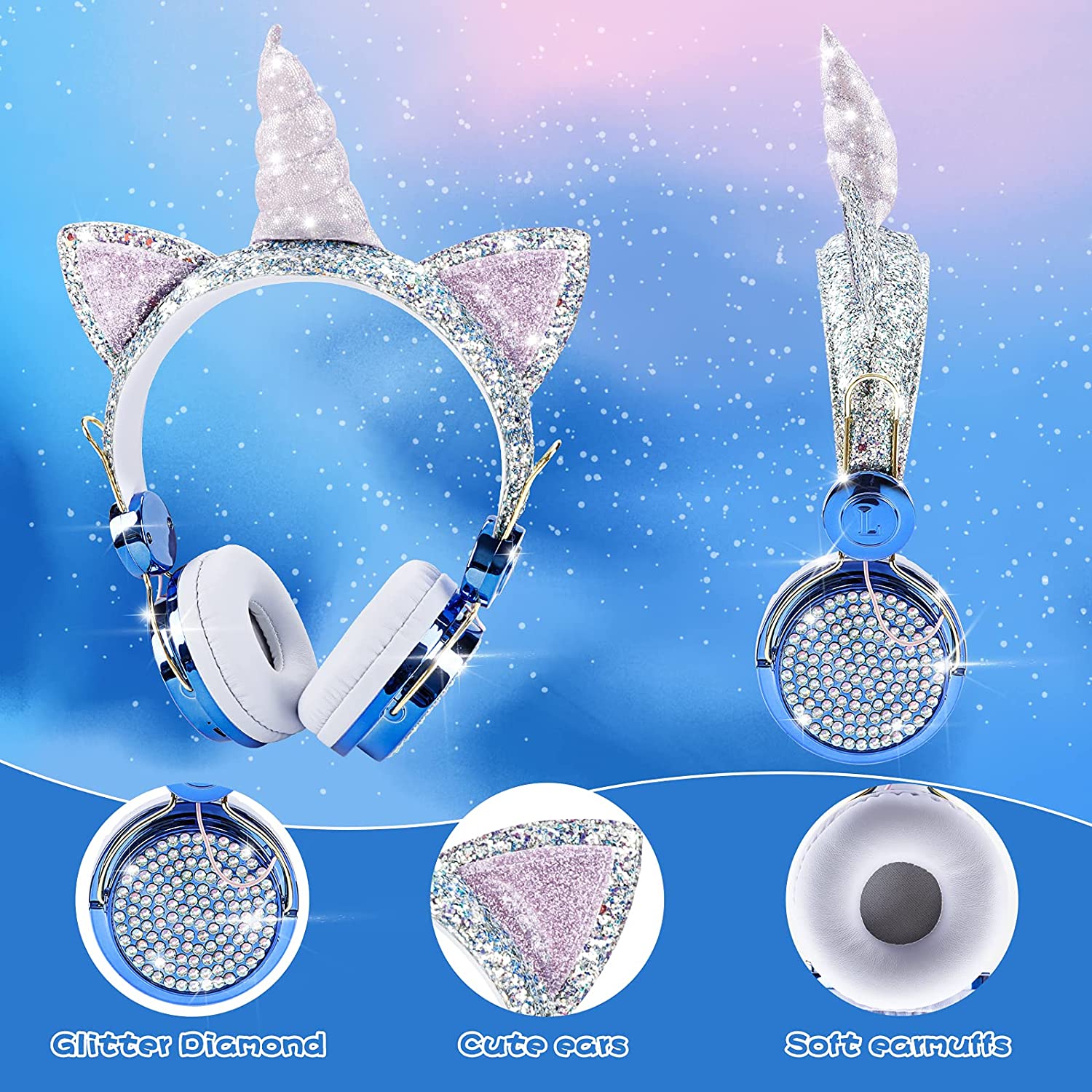 Kids Headphones, Unicorn Bluetooth/Wired Headphones with Microphone Adjustable Headband,85dB Volume Limited HD Sound Headphones for School, Birthday, Xmas, Unicorn Gift (Diamond Blue)