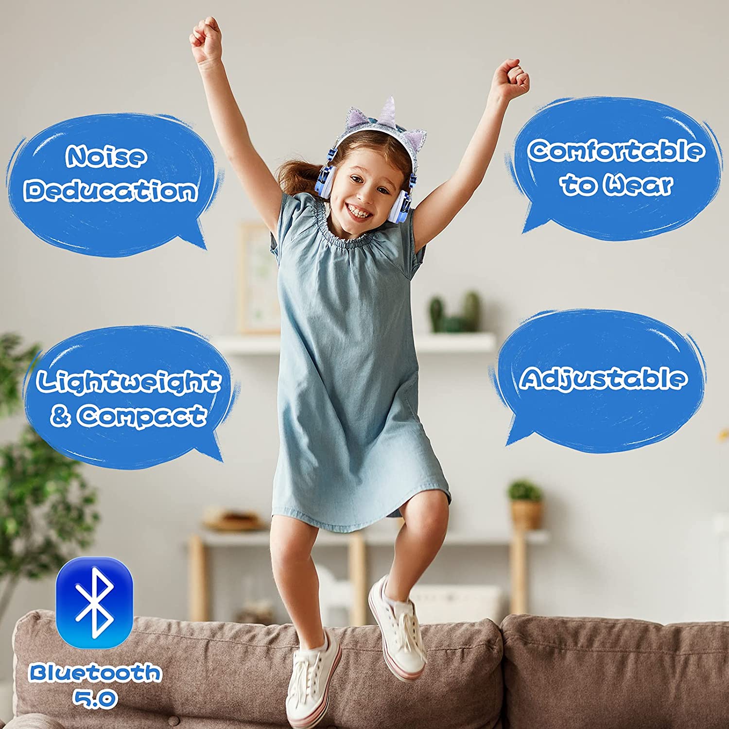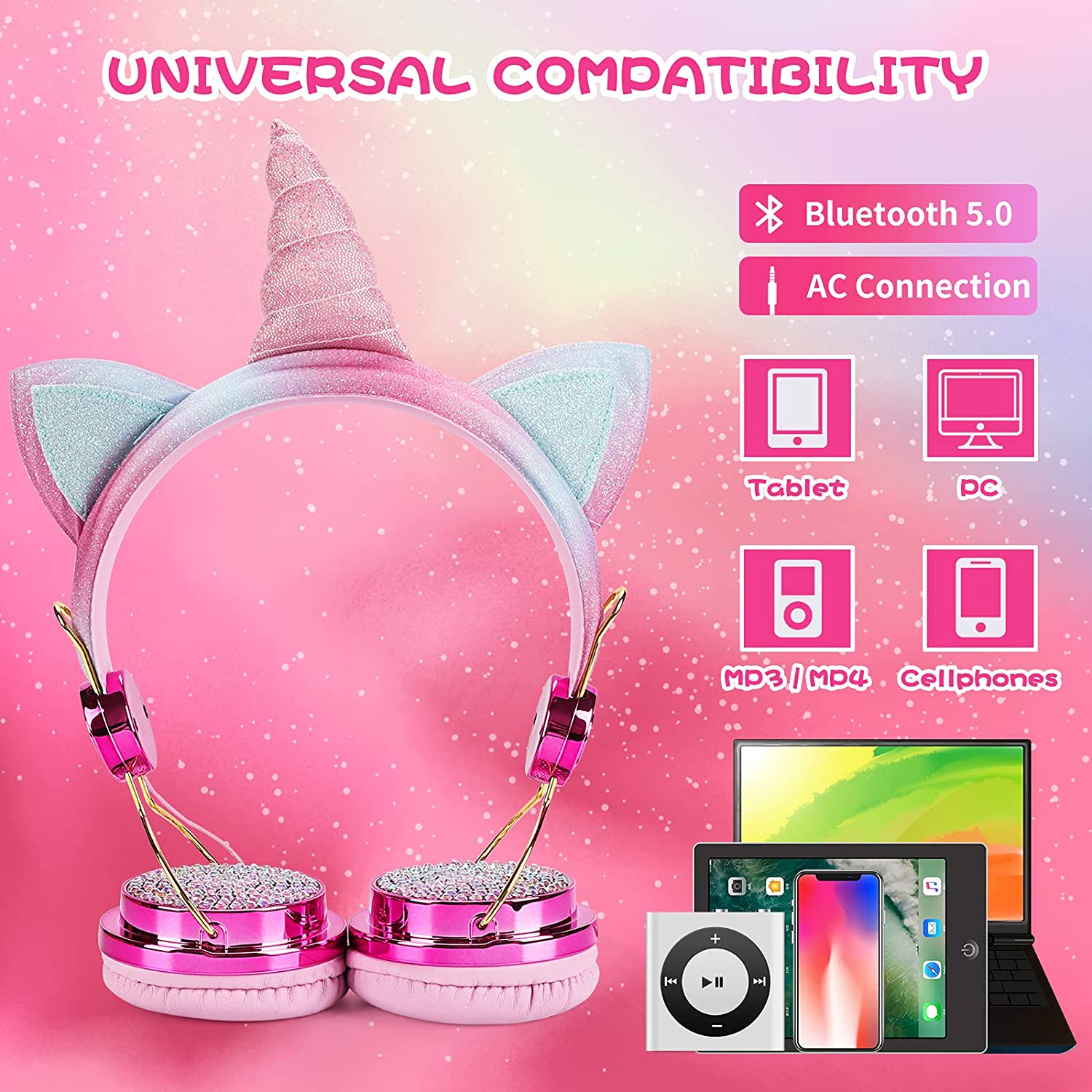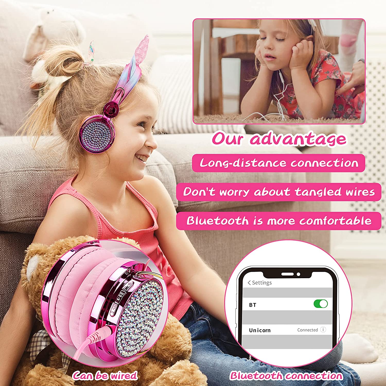 Kids Headphones, Unicorn Bluetooth/Wired Headphones with Microphone Adjustable Headband,85dB Volume Limited HD Sound Headphones for School, Birthday, Xmas, Unicorn Gift (Diamond Blue)